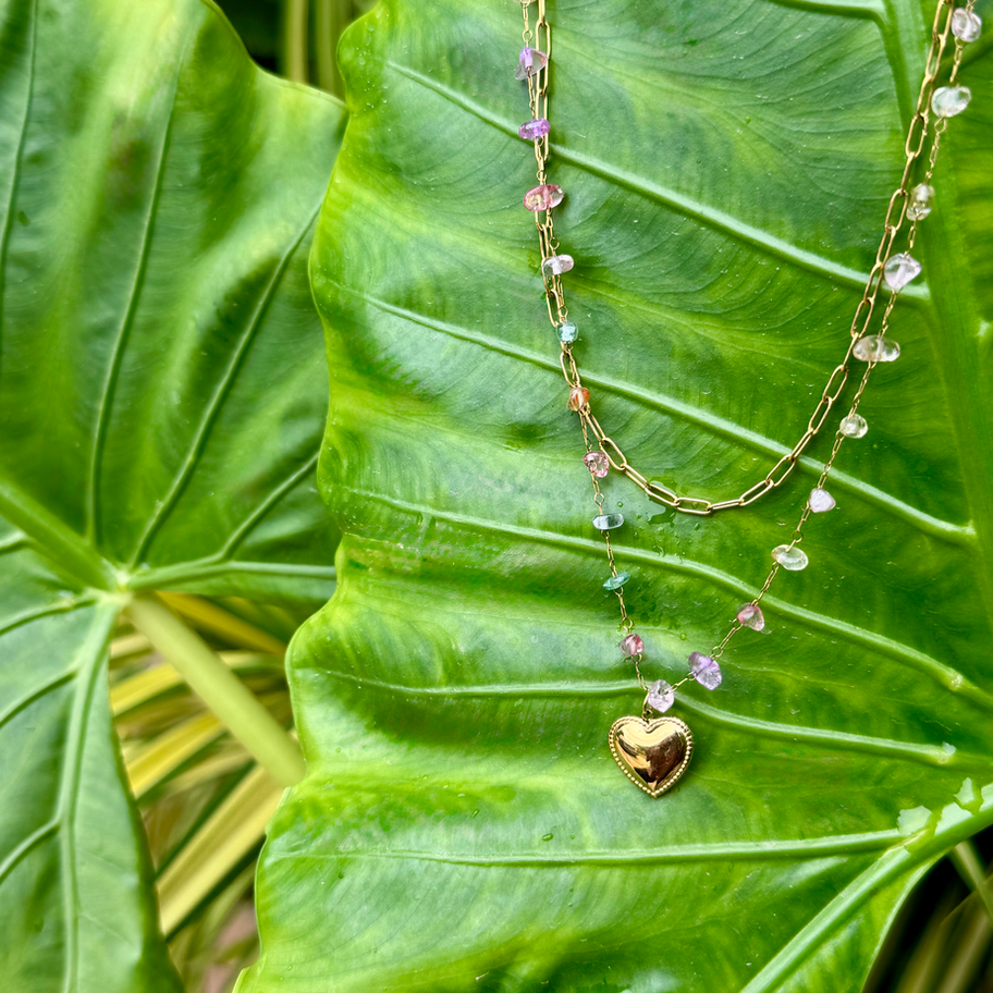 Features: Multicolor gravel-style beads, geometric heart charm, double-layer chain design